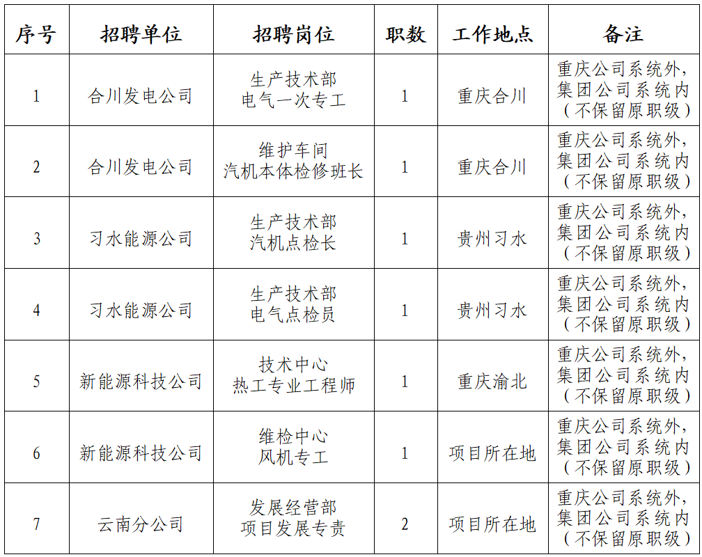 根據(jù)重慶公司發(fā)展需要,重慶公司所屬單位現(xiàn)面向重慶公司系統(tǒng)外、國家電投集團系統(tǒng)內(nèi)公開招聘有關(guān)人員,具體事項公告如下: