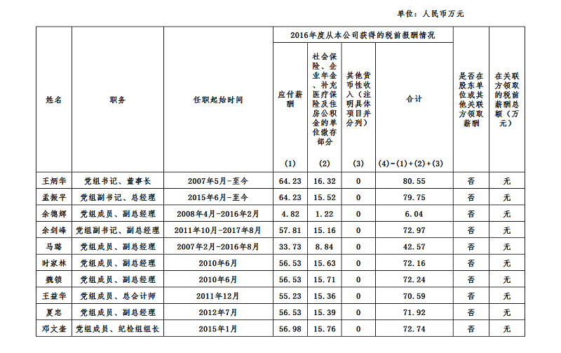 國家電力投資集團公司企業(yè)負責人2016年度薪酬情況