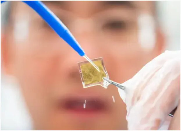 ▲用于生產(chǎn)氫燃料的三層太陽能材料的特寫,其中一滴水突出了其反應(yīng)表面。圖片來源:林雪平大學(xué)/Olov Planthaber