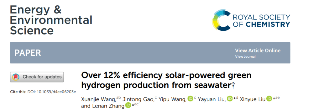 日前,相關(guān)論文以《從海水中生產(chǎn)太陽(yáng)能綠色泡沫的效率超過12%》(Over 12%efficiency Solar-powered green Hydro production from seawater)為題在 Energy & Environmental Science [1]中發(fā)表。理海大學(xué)助理教授王炫杰為第一作者,康奈爾大學(xué)助理教授張樂楠、多倫多州立大學(xué)助理教授劉心悅和霍普金斯大學(xué)助理教授劉亞媛?lián)喂餐ㄓ嵶髡摺?/p>