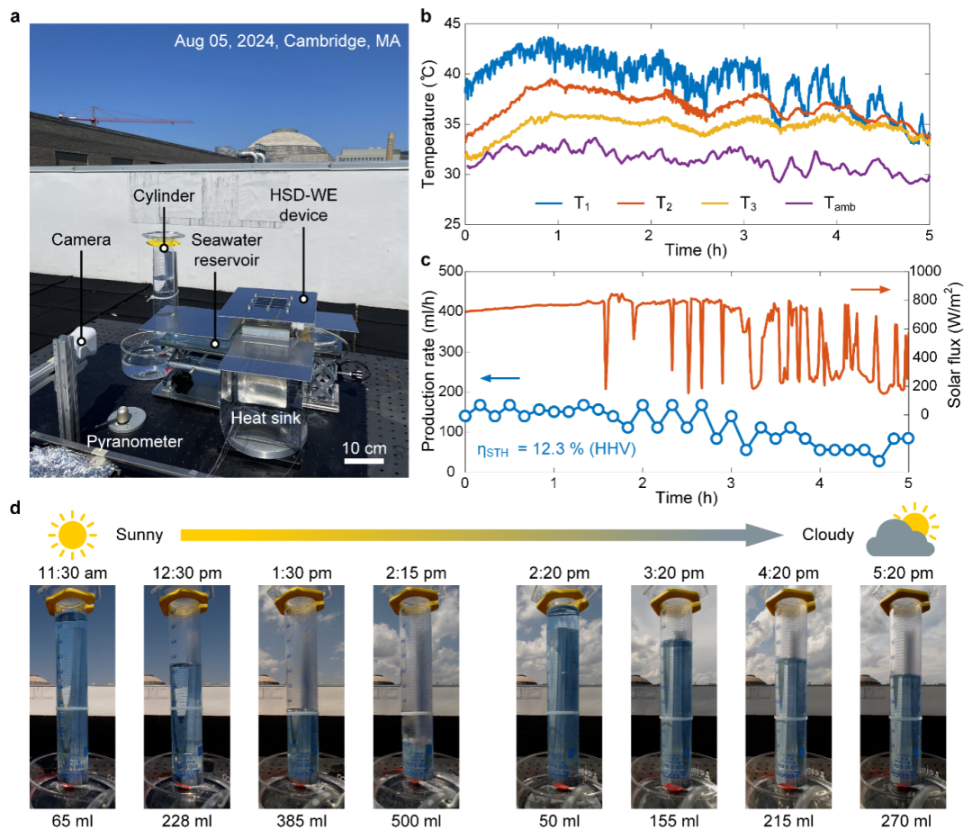 在海水淡化方面,團(tuán)隊(duì)前期研發(fā)的光熱界面蒸發(fā)技術(shù),通過局域高效化熱管理,將熱能集中作用于蒸發(fā)表面,大幅提升了蒸發(fā)效率。通過這種宏觀系統(tǒng)耦合與部分優(yōu)化器件的協(xié)同創(chuàng)新,最終實(shí)現(xiàn)了太陽(yáng)能驅(qū)動(dòng)下、水面的制氫與淡水聯(lián)產(chǎn)。