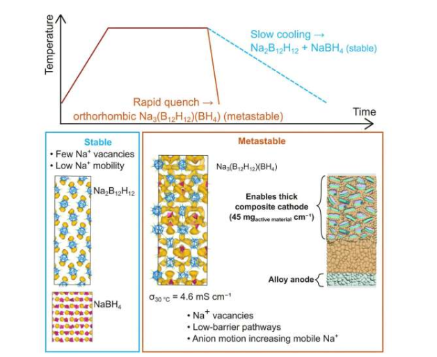 研究采用氫硼酸鈉材料,通過加熱再快速冷卻的成熟工藝,獲得了一種亞穩(wěn)態(tài)晶體結(jié)構(gòu)。該結(jié)構(gòu)具有較高的離子電導率,比文獻記載的數(shù)值提升了一個數(shù)量級。第一作者Sam Oh表示:“我們穩(wěn)定了一種從未被報道過的亞穩(wěn)態(tài)結(jié)構(gòu),其離子電導率比前體本身高出三到四個數(shù)量級。”