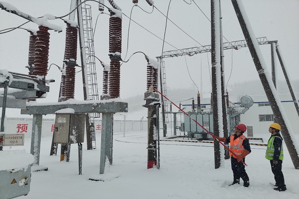 ▲為避免發(fā)配電、集電線路等設備產生積雪、覆冰,東方能源(河北公司、雄安公司)張家口中寶風電場員工在保證安全的前提下,兩人一組每兩小時對絕緣子積雪進行清理,確保設備正常運轉。