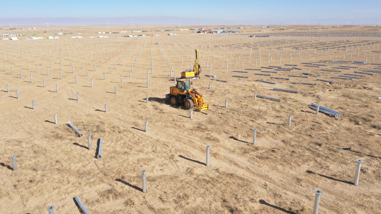 海南州特高壓外送通道配套電源點220萬光伏項目的建設現(xiàn)場之一,圖為正在安裝的陣列區(qū)鋼管樁